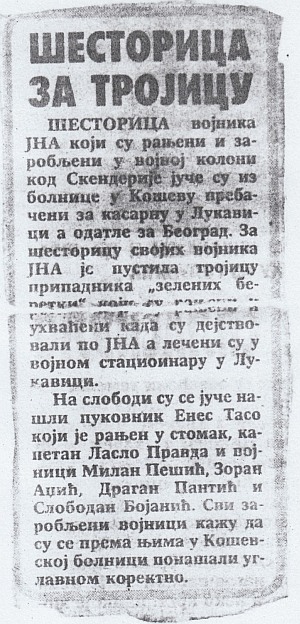Дана 11.5.1992. по звуку ауспуха препознао сам да је напољу стигао камион ТАМ 110 или 150. Погледао сам кроз прозор и видео да је стигла санитетска ,,стодесетка“. Питао сам сестру која је тада била у соби да ли је то дошла по нас, а она је отишла да провери. Након тога се појавила једна докторица и рекла да се спремимо и да идемо. Тако смо нас тројица захваљујући залагању те сестре која је била Муслиманка размењени заједно са капетаном Правдом, пуковником Енес Тасом и војником Миланом Пејићем (погрешно написано Пешићем), по које је у ствари дошао санитет. О тој размени и дан данас чувам новински исечак из ,,Вечерњих новости“.